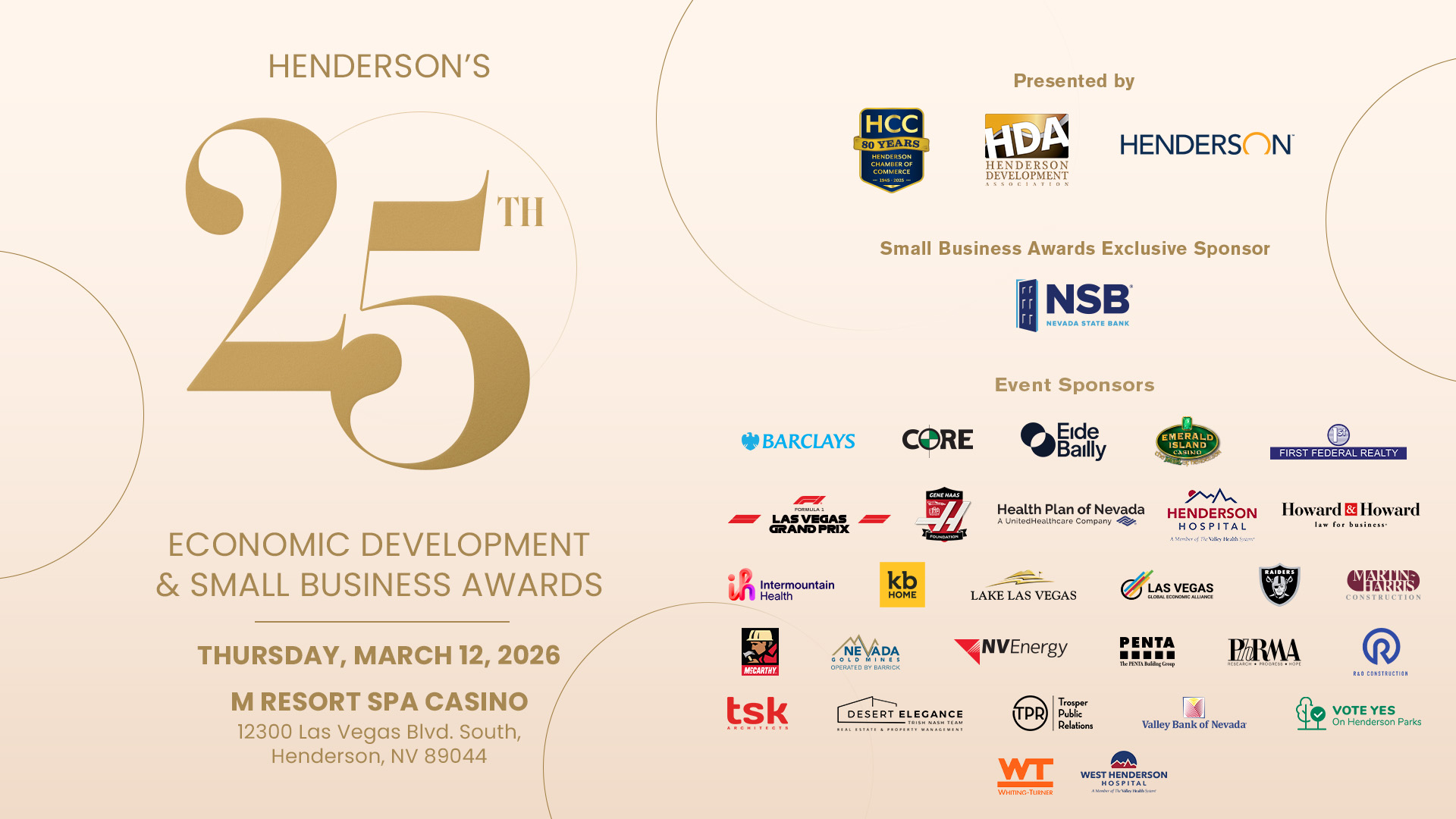 Presented by the Henderson Chamber of Commerce, Henderson Development Association, and City of Henderson, this signature event brings together civic and industry leaders to honor innovation, leadership, and lasting community impact. Join us as we recognize 25 years of progress and the people powering Henderson’s success.