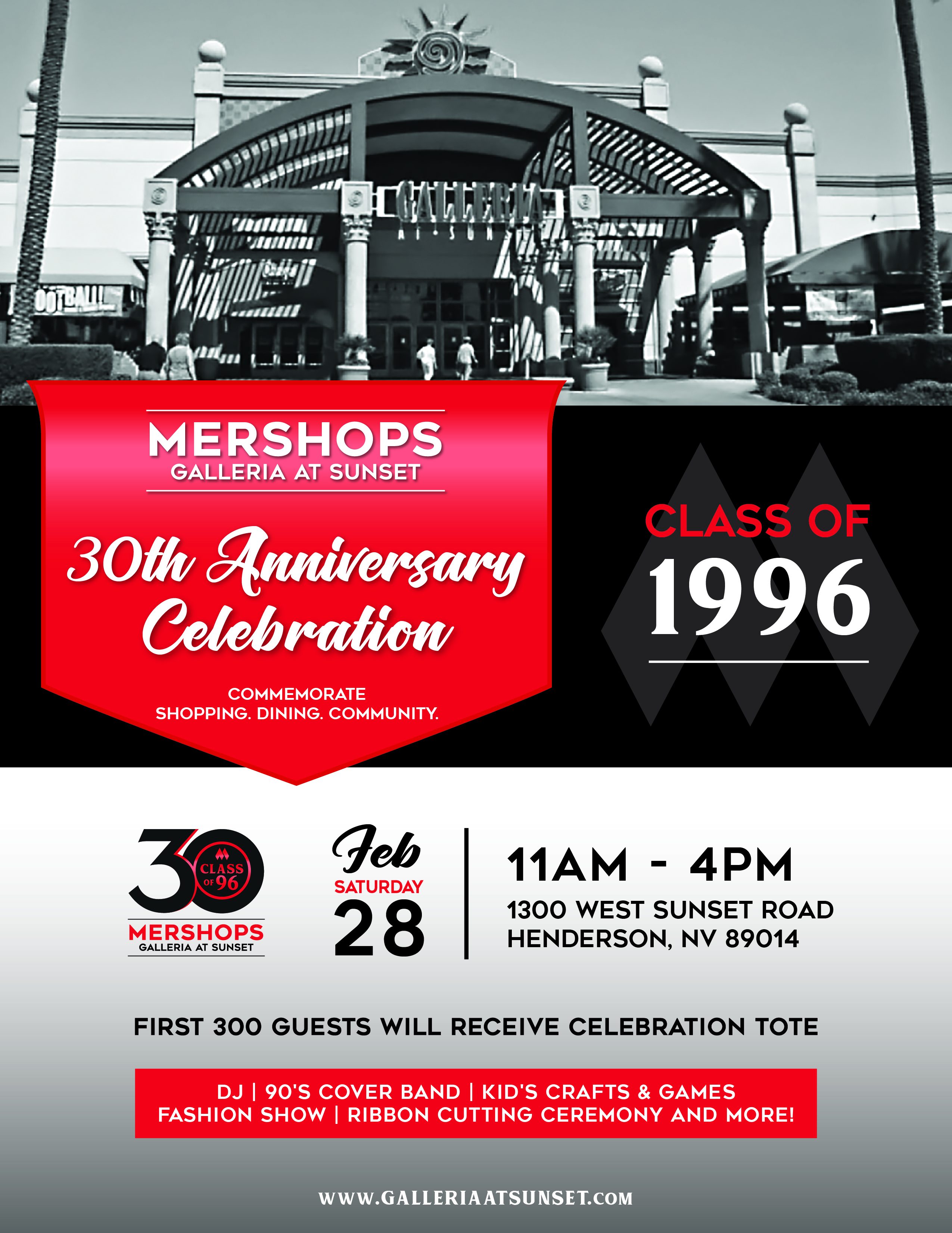 Join us as Galleria at Sunset celebrates 30 years in the heart of Henderson! Our “Class of ’96” Anniversary Celebration will feature live entertainment, a 90’s cover band, family-friendly activities, a fashion show, giveaways, and special ceremonies honoring our community partners and local leaders. This free, community-wide event is designed to bring families, businesses, and neighbors together to celebrate three decades of shopping, dining, and connection.